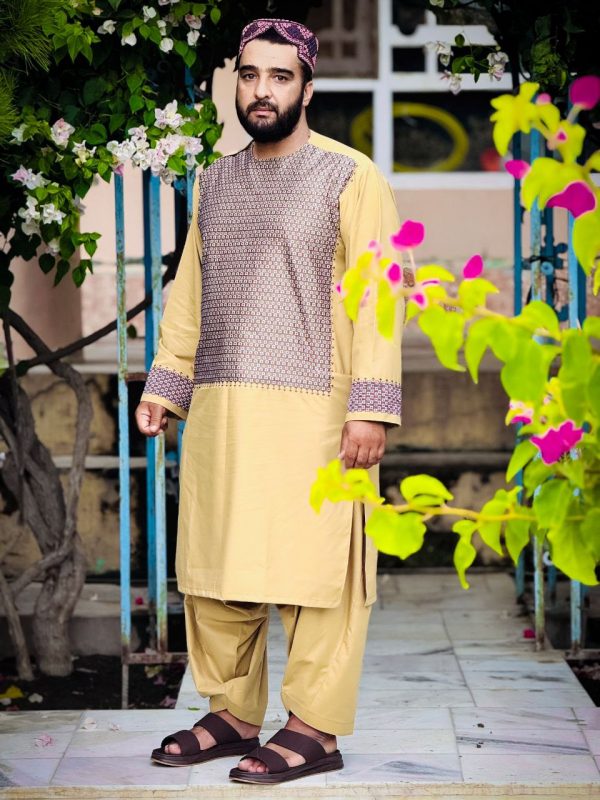 A classic Kandahari perahan tunban, known for its loose comfort and elegant draping. Machine-stitched with high-quality cotton, this outfit is ideal for cultural events, weddings, and daily wear. Its breathable fabric and fine embroidery reflect the timeless style of Kandahar.